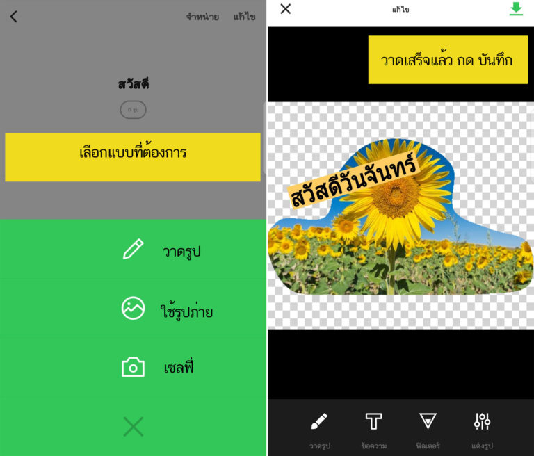 โดยจะมีให้เลือกถึง 3 ฟังก์ชั่นด้วยกัน คือ ไอคอนปากกา สำหรับวาดเอง พิมพ์เอง บนมือถือคุณ ,ไอคอนรูปภาพ เลือกรูปถ่ายมาแต่งภาพทำสติ๊กเกอร์ และไอคอนกล้อง สำหรับถ่าย Selfie แล้วแต่งภาพทำสติ๊กเกอร์